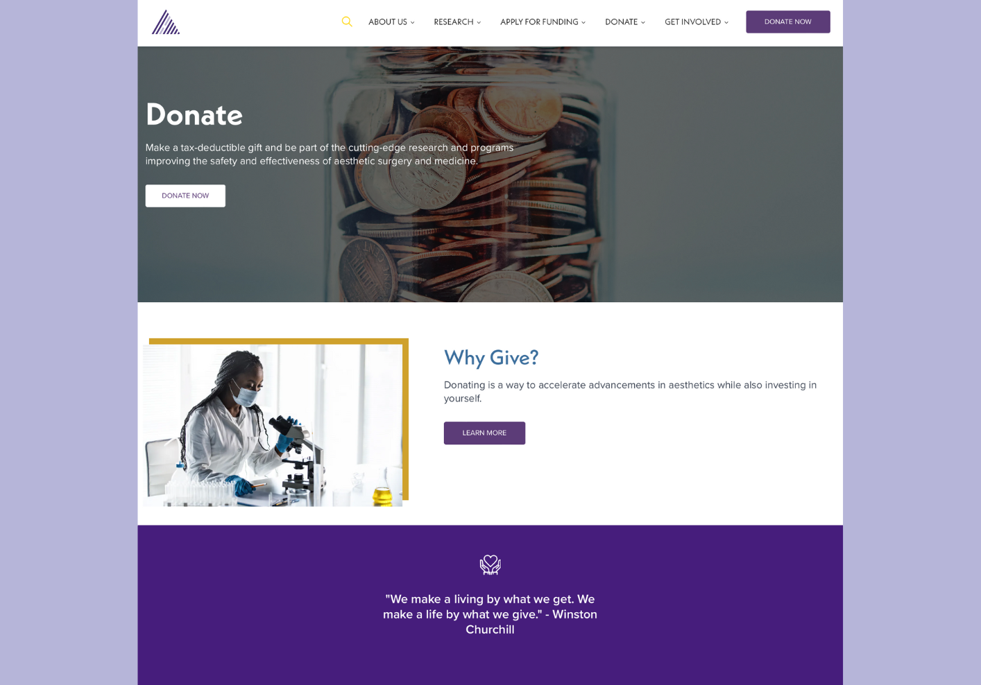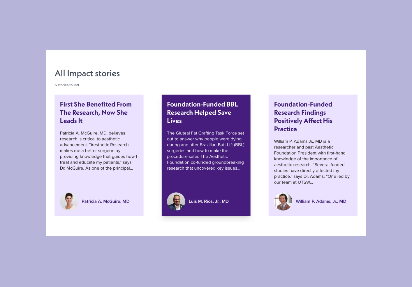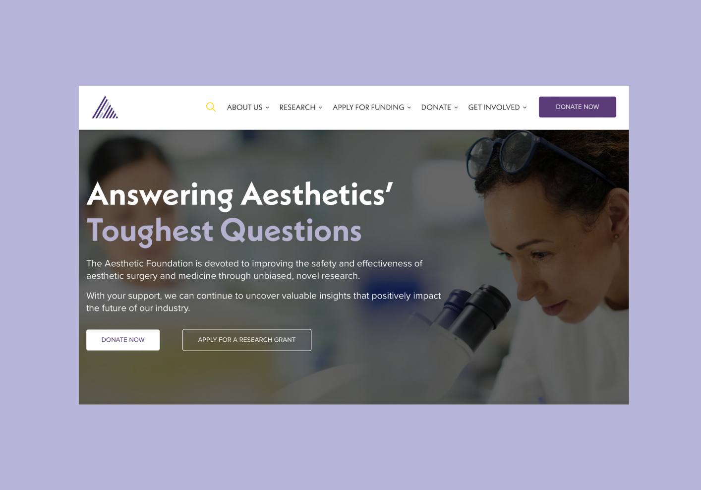 After successfully rebranding The Aesthetic Society, the team asked me to help rebrand the “research arm” of their organization, The Aesthetic Surgery Education and Research Foundation (ASERF). ASERF lacked awareness, and people struggled to understand the tremendous impact they had on advancing the plastic surgery industry. My first recommendation was to change the name to The Aesthetic Foundation, so it better represents its diverse offerings, creates a stronger link to The Aesthetic Society, and is easier to say and remember. I also conducted research that led me to develop a new brand strategy, messaging, and donor tiers. I assisted in the development of their new website. I led their web strategy, mapped out a design approach, and wrote the copy, including “impact stories” that shine a light on all the lives The Aesthetic Foundation has positively impacted. I’m currently helping them with their #FoundationFriday social media content and email marketing.